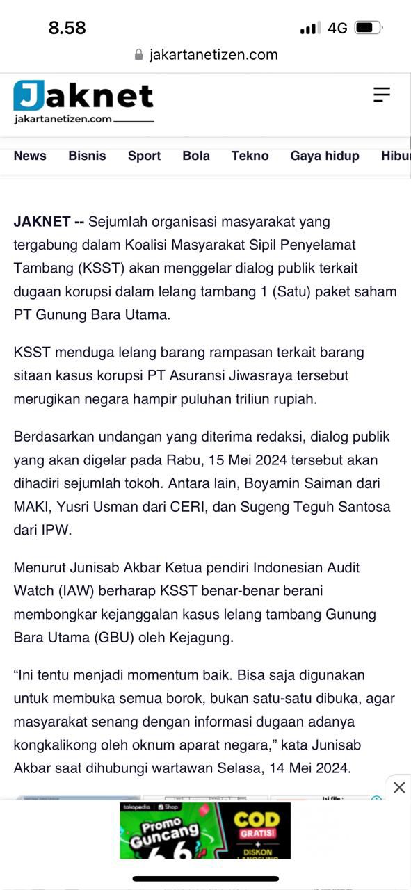 Dalam surat tersebut CERI mengajukan konfirmasi dan pertanyaan perihal berita yang telah terbit di Media Jakartanetizen.com, yang berjudul “Rugikan Negara hingga Puluhan Triliun, KSST Bakal Bongkar Kejanggalan Lelang Aset Jiwasraya” tertanggal 14 Mei 2024, di mana pada paragraf ketiga berbunyi, “Berdasarkan undangan yang diterima redaksi, dialog publik yang akan digelar pada Rabu, 15 Mei 2024 tersebut akan dihadiri sejumlah tokoh. Antara lain, Boyamin Saiman dari MAKI, Yusri Usman dari CERI, dan Sugeng Teguh Santosa dari IPW.”